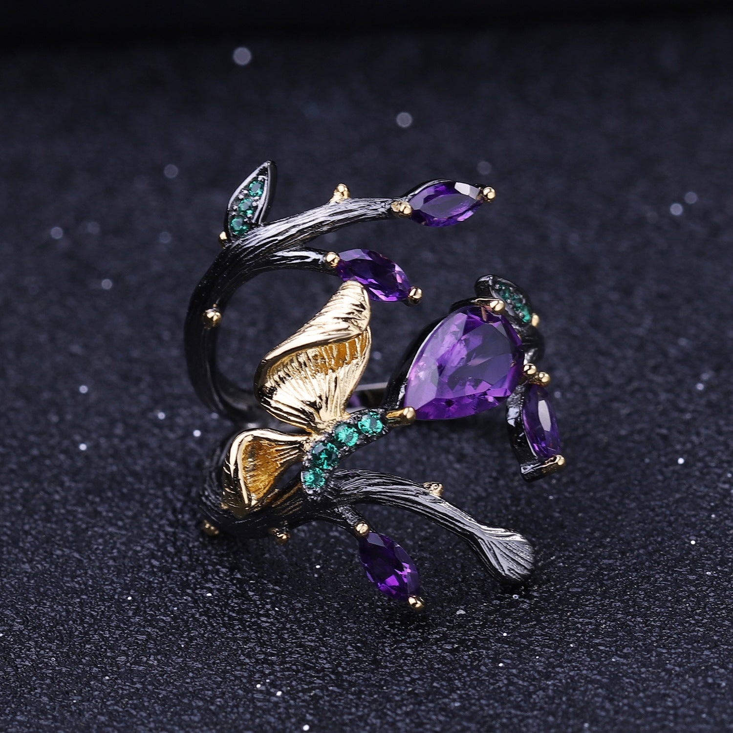 OliyaDesign Russian Secret Garden Natural Style Butterfly S925 Sterling Silver Natural Amethyst Ring